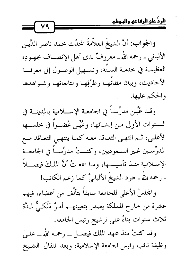 وقد عُيِّن مدرِّساً في الجامعة الإسلامية بالمدينة في السنوات الأولى من إنشائها، وعُيِّن عُضواً في مجلسها الأعلى، ثم انتهى التعاقد معه كما ينتهي التعاقد مع المدرِّسين غير السعوديين، وكنتُ مدرِّساً في الجامعة الإسلامية منذ تأسيسها، وما سمعتُ أنَّ الملكَ فيصلاً رحمه الله طرد الشيخَ الألبانيَّ كما زعم الكاتب!