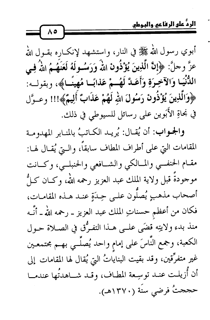 أبوي رسول الله صلى الله عليه وسلم في النار، واستشهد لإنكارِه بقول الله عزَّ وجلَّ: {إِنَّ الَّذِينَ يُؤْذُونَ اللهَ وَرَسُولَهُ لَعَنَهُمُ اللهُ فِي الدُّنْيَا وَالآخِرَةِ وَأَعَدَّ لَهُمْ عَذابًا مُهِينًا} ، وبقوله: {وَالَّذِينَ يُؤْذُونَ رَسُولَ اللهِ لَهُمْ عَذَابٌ أَلِيمٌ} !!! وعوَّل في نجاةِ الأَبَوين على رسائل للسيوطي في ذلك.