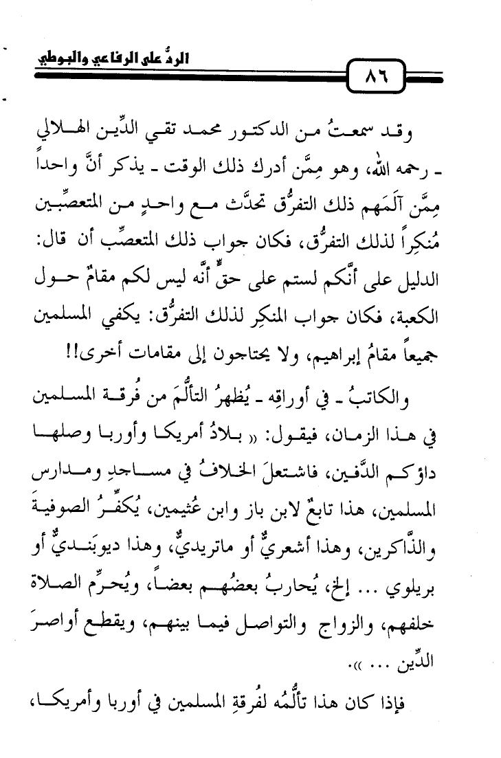 وقد سمعتُ من الدكتور محمد تقي الدِّين الهلالي رحمه الله، وهو مِمَّن أدرك ذلك الوقت يذكر أنَّ واحداً مِمَّن آلَمَهم ذلك التفرُّق تحدَّث مع واحدٍ من المتعصِّبين مُنكِراً لذلك التفرُّق، فكان جواب ذلك المتعصِّب أن قال: الدليل على أنَّكم لستم على حقٍّ أنَّه ليس لكم مقامٌ حول الكعبة، فكان جواب المنكِر لذلك التفرُّق: يكفي المسلمين جميعاً مقامُ إبراهيم، ولا يحتاجون إلى مقامات أخرى!!