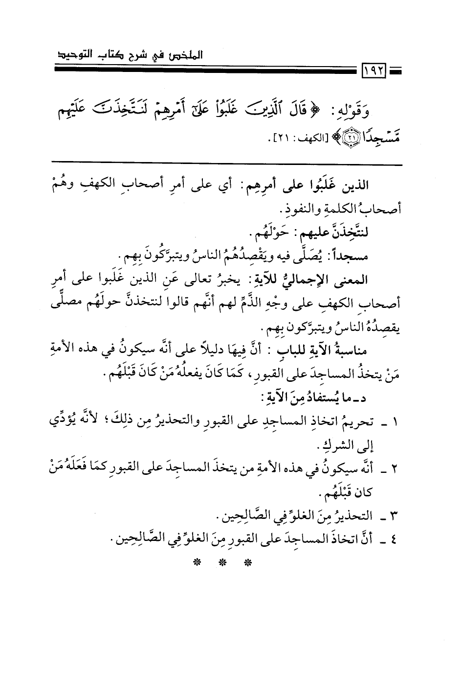 المعنى الإجمالي للآية: يخبر تعالى عن الذين غلبوا على أمر أصحاب الكهف على وجه الذم لهم أنهم قالوا لنتخذن حولهم مصلى يقصِده الناس ويتبركون بهم.