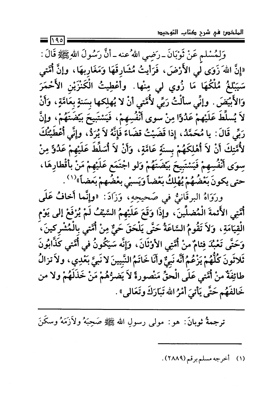 ولمسلم عن ثوبان -رضي الله عنه- أن رسول الله - صَلَّى اللَّهُ عَلَيْهِ وَسَلَّمَ- قال: "إن الله زوى لي الأرض، فرأيت مشارقها ومغاربها، وإن أمتي سيبلغ ملكها ما زُوي لي منها. وأعطيت الكنزين: الأحمر والأبيض. وإني سألت ربي لأمتي أن لا يهلكها بسَنَة بِعَامَّة، وأن لا يسلط عليهم عدواً من سوى أنفسهم، فيستبيح بيضتهم، وإن ربي قال: يا محمد، إذا قضيت قضاءً فإنه لا يرد، وإني أعطيتك لأمتك ألا أهلكهم بسنة بعامة، وألا أسلط عليهم عدواً من سوى أنفسهم فيستبيح بيضتهم ولو اجتمع عليهم من بأقطارها، حتى يكون بعضهم يهلك بعضاً ويسبي بعضهم بعضًا" (1) .