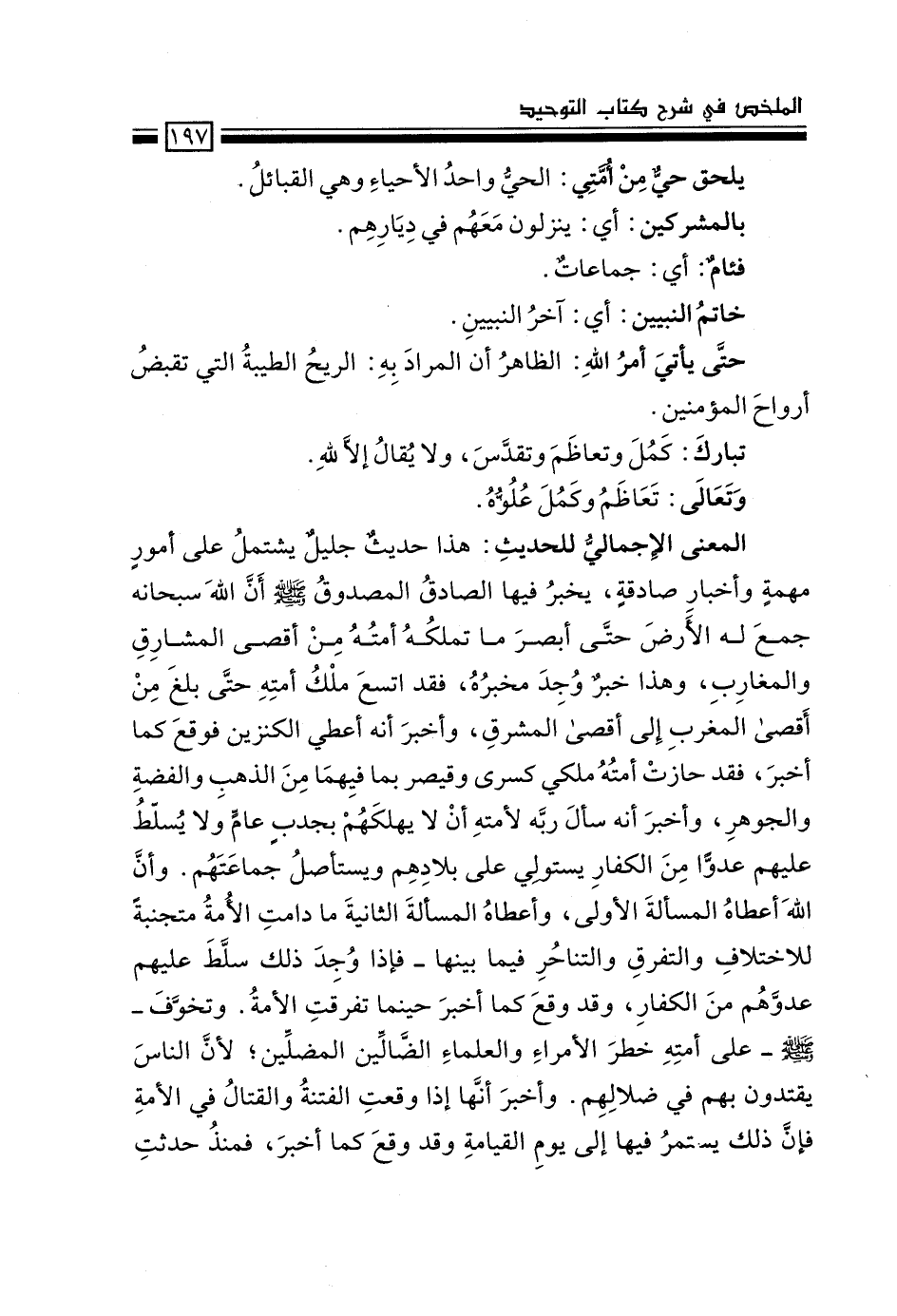 المعنى الإجمالي للحديث: هذا حديثٌ جليلٌ يشتمل على أمور مهمة وأخبار صادقة، يخبر فيها الصادق المصدوق –صَلَّى اللَّهُ عَلَيْهِ وَسَلَّمَ- أن الله سبحانه جمع له الأرض حتى أبصر ما تملكه أمته من أقصى المشارق والمغارب، وهذا خبرٌ وُجد مخبره، فقد اتسع ملك أمته حتى بلغ من أقصى المغرب إلى أقصى المشرق، وأخبر أنه أُعطي الكنزين فوقع كما أخبر، فقد حازت أمته ملكي كسرى وقيصر بما فيهما من الذهب والفضة والجوهر، وأخبر أنه سأل ربه لأمته أن لا يهلكهم بجدبٍ عامٍّ ولا يسلط عليهم عدواً من الكفار يستولي على بلادهم ويستأصل جماعتهم. وأن الله أعطاه المسألة الأولى، وأعطاه المسألة الثانية ما دامت الأمة متجنبة للاختلاف والتفرق والتناحر فيما بينها –فإذا وُجد ذلك سلط عليهم عدوهم من الكفار، وقد وقع كما أخبر حينما تفرقت الأمة. وتخوّف –صَلَّى اللَّهُ عَلَيْهِ وَسَلَّمَ- على أمته خطر الأمراء والعلماء الضالين المضلين؛ لأن الناس يقتدون بهم في ضلالهم. وأخبر أنها إذا وقعت الفتنة والقتال والأمة فإن ذلك يستمر فيها إلى يوم القيامة وقد وقع كما أخبر، فمنذ حدثتِ