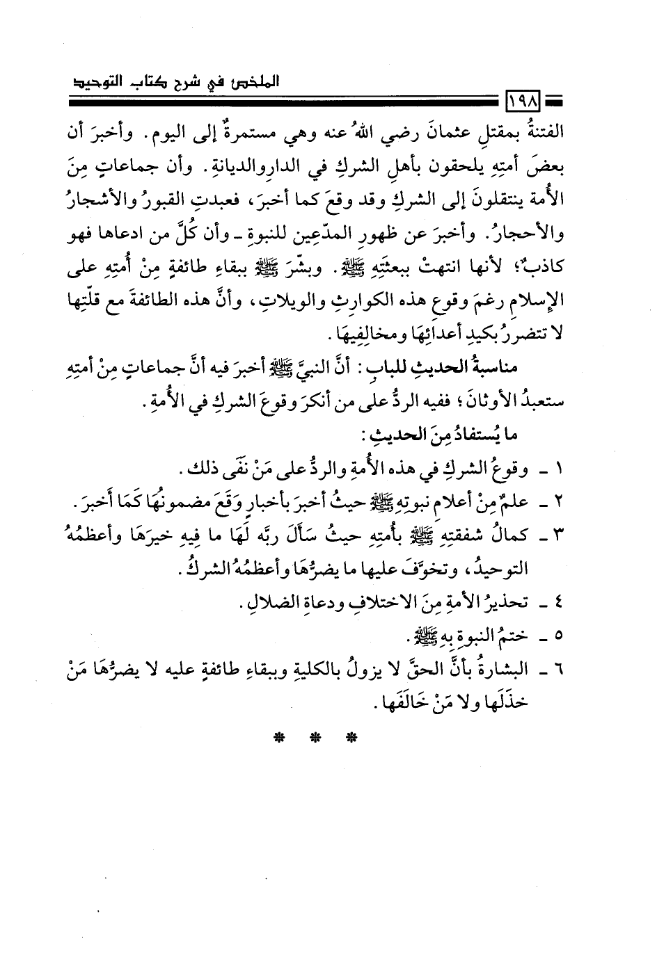 الفتنة بمقتل عثمان رضي الله عنه وهي مستمرة إلى اليوم. وأخبر أن بعض أمته يلحقون بأهل الشرك في الدار والديانة. وأن جماعاتٍ من الأمة ينتقلون إلى الشرك وقد وقع كما أخبر، فعُبدت القبور والأشجار والأحجار. وأخبر عن ظهور المدّعين للنبوة –وأن كل من ادعاها فهو كاذب؛ لأنها انتهت ببعثته –صَلَّى اللَّهُ عَلَيْهِ وَسَلَّمَ-. وبشّر –صَلَّى اللَّهُ عَلَيْهِ وَسَلَّمَ- ببقاء طائفة من أمته على الإسلام رغمَ وقوع هذه الكوارث والويلات، وأن هذه الطائفة مع قِلّتها لا تتضرر بكيد أعدائها ومخالفيها.