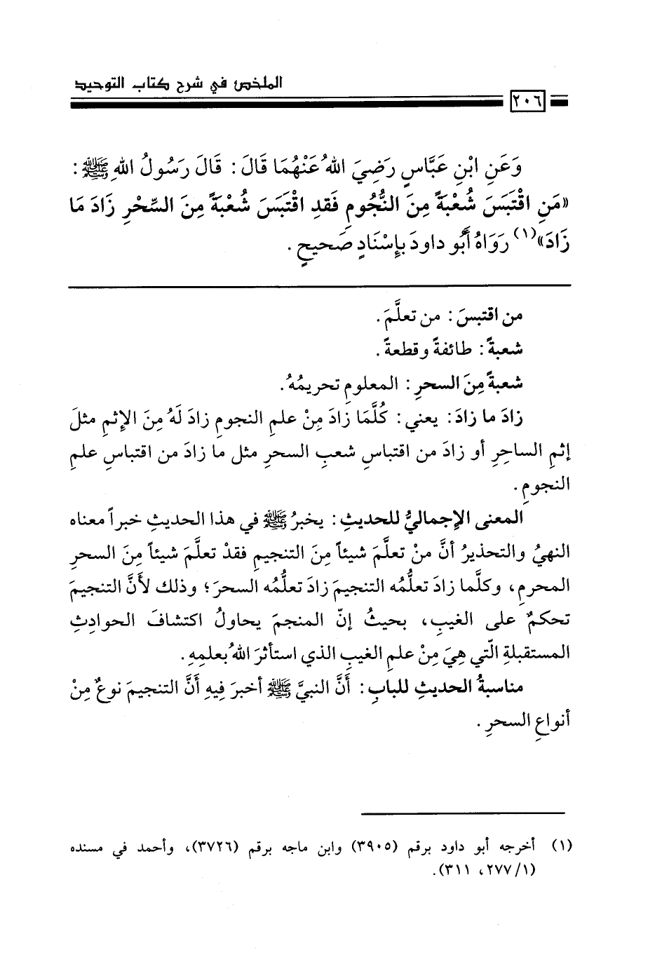 وعن ابن عباس رضي الله عنهما قال: قال رسول الله - صَلَّى اللَّهُ عَلَيْهِ وَسَلَّمَ-: "من اقتبس شعبة من النجوم فقد اقتبس شعبة من السحر زادَ ما زادَ" (1) رواه أبو داود بإسنادٍ صحيح.