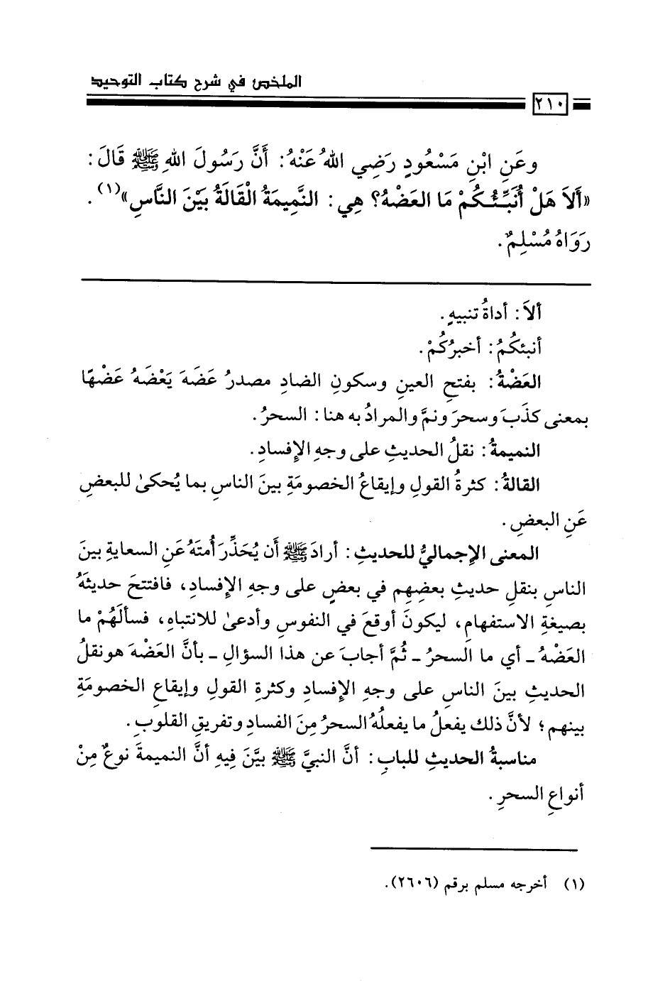 وعن ابن مسعود رضي الله عنه: أن رسول الله - صَلَّى اللَّهُ عَلَيْهِ وَسَلَّمَ- قال: "ألا هل أنبئكم ما العَضْهُ؟ هي: النميمة القالةُ بين الناس" (1) . رواه مسلم.