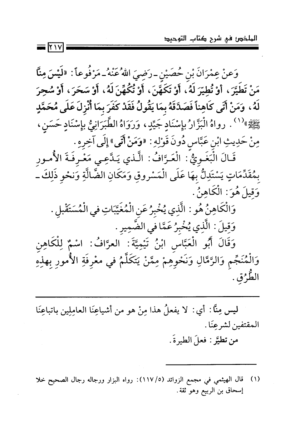 وعن عمران بن حصين -رضي الله عنه- مرفوعاً: "ليس منا من تَطيّر أو تُطير له، أو تَكهن أو تُكهن له، أو سَحر أو سُحر له، ومن أتى كاهناً فصدقه بما يقول فقد كفر بما أنزل على محمد - صَلَّى اللَّهُ عَلَيْهِ وَسَلَّمَ-" (1) رواه البراز بإسناد جيد، ورواه الطبراني في الأوسط بإسناد حسن من حديث ابن عباس دون قوله: "ومن أتى" إلى آخره.