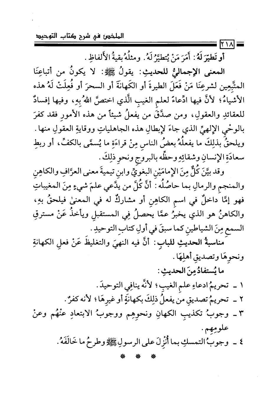 وقد بين كلٌّ من الإمامين البغوي وابن تيمية معنى العرّاف والكاهن المنجم والرّمّال بما حاصلُه: أن كل من يدعي علم شيءٍ من المغيبات فهو إما داخلٌ في اسم الكاهن أو مشاركٌ له في المعنى فيلحق به، والكاهن هو الذي يخبر عما يحصل في المستقبل ويأخذ عن مسترق السمع من الشياطين كما سبق في أول كتاب التوحيد.