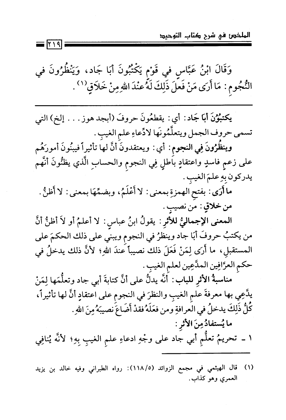 المعنى الإجمالي للأثر: يقول ابن عباس: لا أعلم ولا أظن أن من يكتب حروف أبا جاد وينظر في النجوم ويبني على ذلك الحكم على المستقبل، ما أرى لمن فعل ذلك نصيباً عند الله؛ لأن ذلك يدخل في حكم العرّافين المدّعين لعلم الغيب.