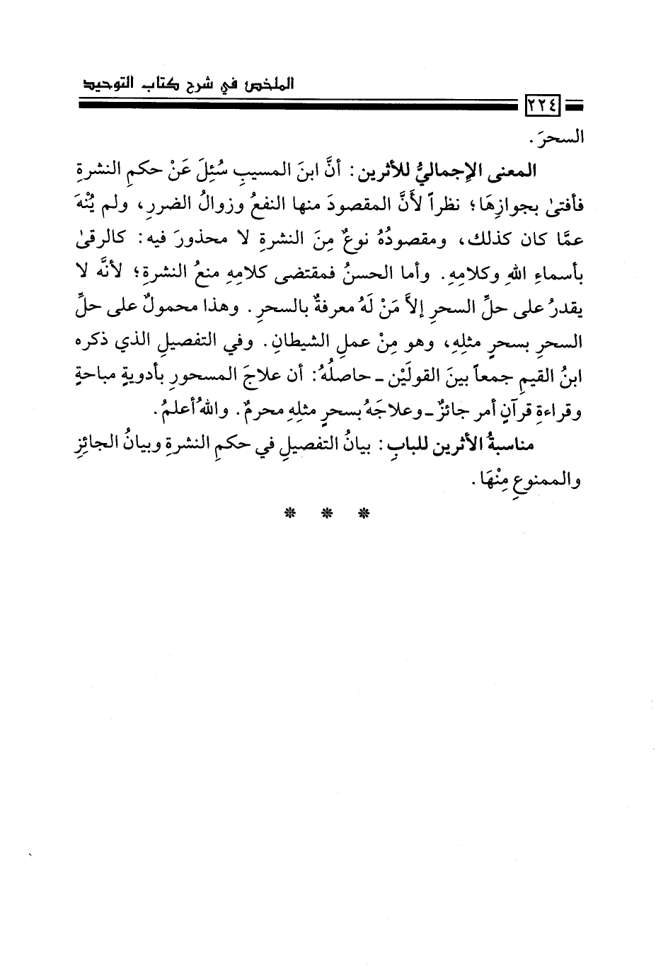 مناسبة الأثرين للباب: بيان التفصيل في حكم النشرة وبيان الجائز والممنوع منها.