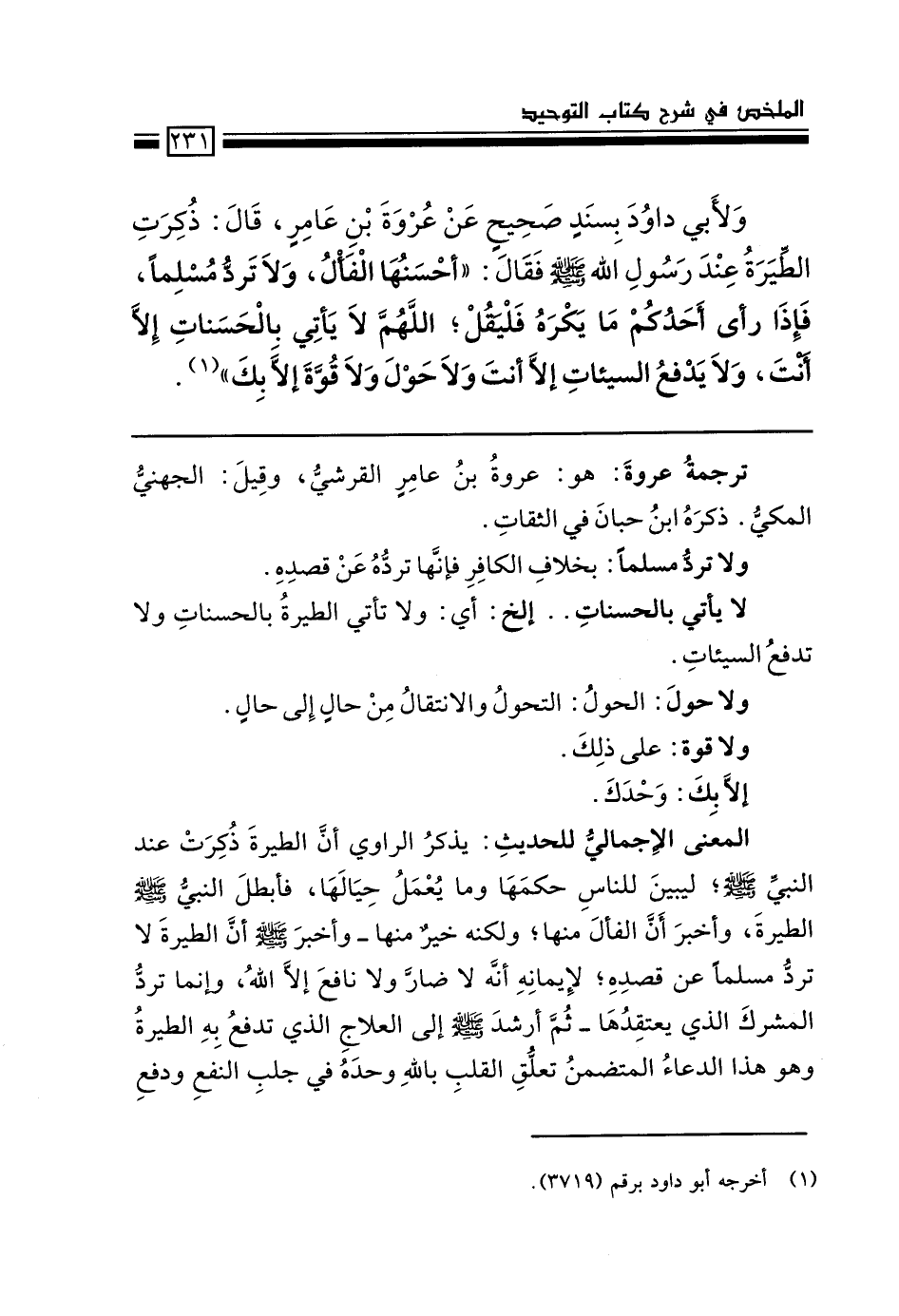 ولأبي داود بسند صحيح عن عروة بن عامر، قال: ذُكِرت الطيرة عند رسول الله - صَلَّى اللَّهُ عَلَيْهِ وَسَلَّمَ- فقال: "أحسنها الفأل، ولا تَردّ مسلماً, فإذا رأى أحدكم ما يكره فليقل: اللهم لا يأتي بالحسنات إلا أنت ولا يدفع السيئات إلا أنت ولا حول ولا قوة إلا بك" (1) .