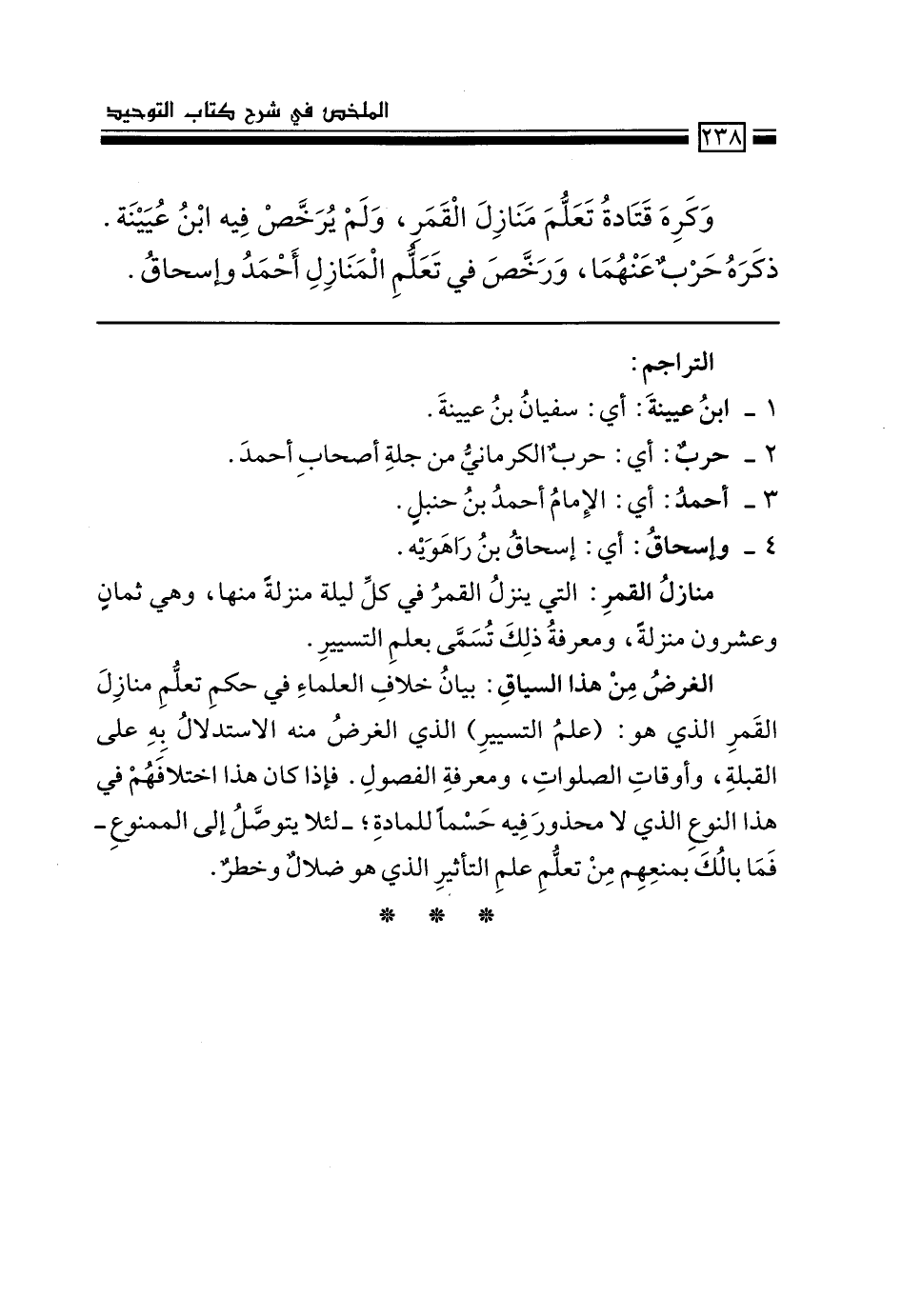 وكره قتادة تعلم منازل القمر، ولم يرخص ابن عيينة فيه. ذكره حرب عنهما، ورخص في تعلم المنازل أحمد وإسحاق.