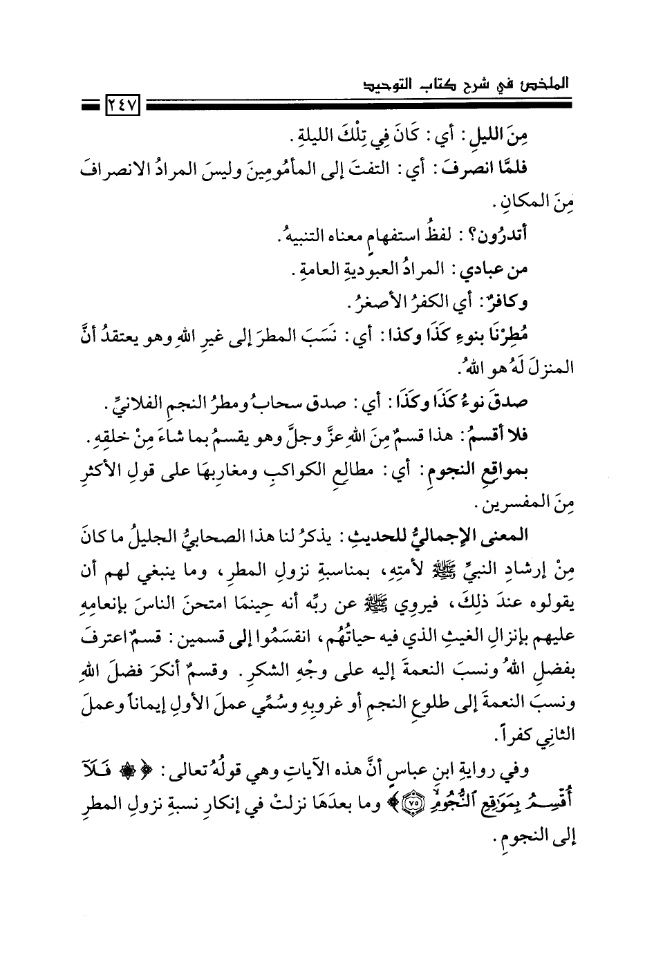 المعنى الإجمالي للحديث: يذكر لنا هذا الصحابي الجليل ما كان من إرشاد النبي –صَلَّى اللَّهُ عَلَيْهِ وَسَلَّمَ- لأمته، بمناسبة نزول المطر، وما ينبغي لهم أن يقولوه عند ذلك، فيروي –صَلَّى اللَّهُ عَلَيْهِ وَسَلَّمَ- عن ربه أنه حينما امتحن الناس بإنعامه عليهم بإنزال الغيث الذي فيه حياتهم، انقسموا إلى قسمين: قسمٌ اعترف بفضل الله ونسب النعمة إليه على وجه الشكر. وقسمٌ أنكر فضل الله ونسب النعمة إلى طلوع النجم أو غروبه وسُمي عمل إيماناً وعمل الثاني كفراً.