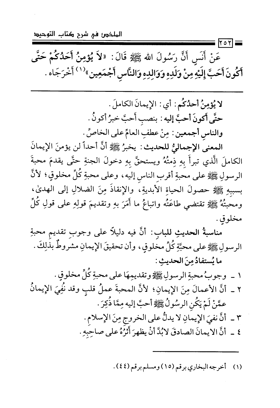 عن أنس أن رسول الله - صَلَّى اللَّهُ عَلَيْهِ وَسَلَّمَ- قال: "لا يؤمن أحدكم حتى أكون أحبَّ إليه من ولده ووالده والناس أجمعين" (1) أخرجاه.