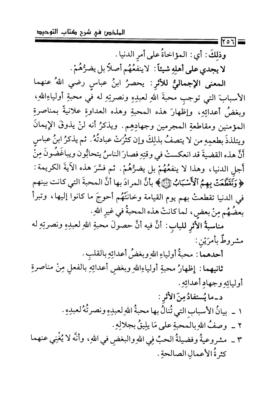 المعنى الإجمالي للأثر: يحصر ابن عباس رضي الله عنهما الأسباب التي توجب محبة الله لعبده ونصرته له في محبة أولياء الله، وبغض أعدائه، وإظهار هذه المحبة وهذه العداوة علانية بمناصرة المؤمنين ومقاطعة المجرمين وجهادهم. ويذكر أنه لن يذوق الإيمان ويتلذذ بطعمه من لا يتصف بذلك وإن كثُرت عبادته. ثم يذكر ابن عباس أن هذه القضية قد انعكست في وقته فصار الناس يتحابون ويباغضون من أجل الدنيا، وهذا لا ينفعهم بل يضرهم. ثم فسر هذه الآية الكريمة. {وَتَقَطَّعَتْ بِهِمُ الأَسْبَابُ} بأن المراد بها أن المحبة التي كانت بينهم في الدنيا تقطعت بهم يوم القيامة وخانتهم أحوج ما كانوا إليها، وتبرأ بعضهم من بعض، لما كانت هذه المحبة في غير الله.