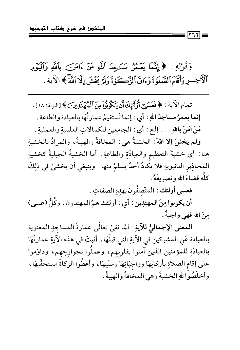 المعنى الإجمالي للآية: لمّا نفى تعالى عمارة المساجد المعنوية بالعبادة عن المشركين في الآية التي قبلها، أثبت في الآية عمارتها بالعبادة للمؤمنين الذين آمنوا بقلوبهم، وعملوا بجوارحهم، وداوموا على إقام الصلاة بأركانها وواجباتها وسننها، وأعطوا الزكاة مستحقيها، وأخلصوا لله الخشية وهي المخافة والهيبة.