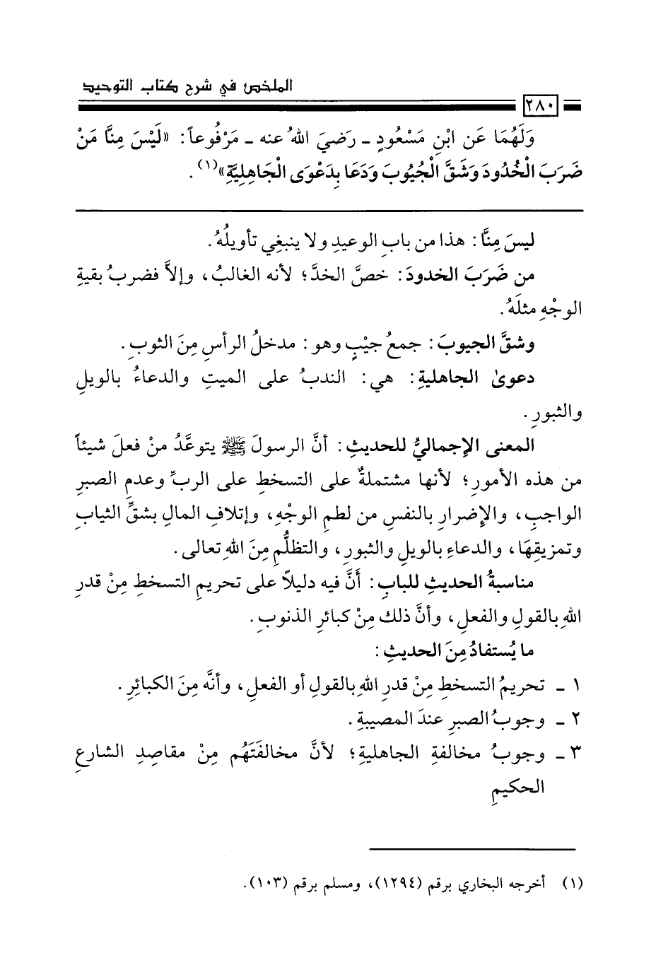ولهما عن ابن مسعود -رضي الله عنه- مرفوعاً: "ليس منا من ضرب الخدود وشقّ الجيوب ودعا بدَعوى الجاهلية" (1) .