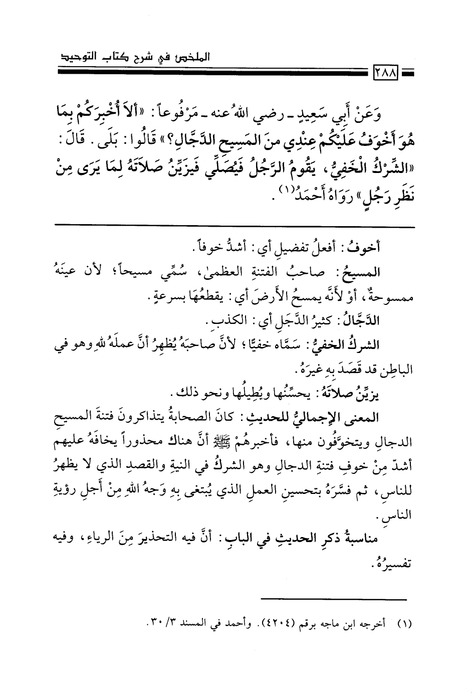 وعن أبي سعيد –رضي الله عنه- مرفوعاً: "ألا أخبركم بما هو أخوف عليكم عندي من المسيح الدجال؟ " قالوا: بلى. قال: "الشرك الخفي، يقوم الرجل فيصلي، فيزيّن صلاته، لما يرى من نظر رجل" رواه أحمد (1) .