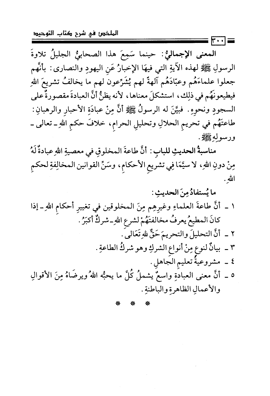 المعنى الإجمالي: حينما سمع هذا الصحابي الجليل تلاوة الرسول -صَلَّى اللَّهُ عَلَيْهِ وَسَلَّمَ- لهذه الآية التي فيها الإخبار عن اليهود والنصارى: بأنهم جعلوا علماءهم وعبّادهم آلهة لهم يشرعون لهم ما يخالف تشريع الله فيطيعونهم في ذلك، استشكل معناها، لأن يظن أن العبادة مقصورة على السجود ونحوه. فبين له الرسول -صَلَّى اللَّهُ عَلَيْهِ وَسَلَّمَ- أن من عبادة الأحبار والرهبان: طاعتهم في تحريم الحلال وتحليل الحرام، خلاف حكم الله -تعالى- ورسوله -صَلَّى اللَّهُ عَلَيْهِ وَسَلَّمَ-.