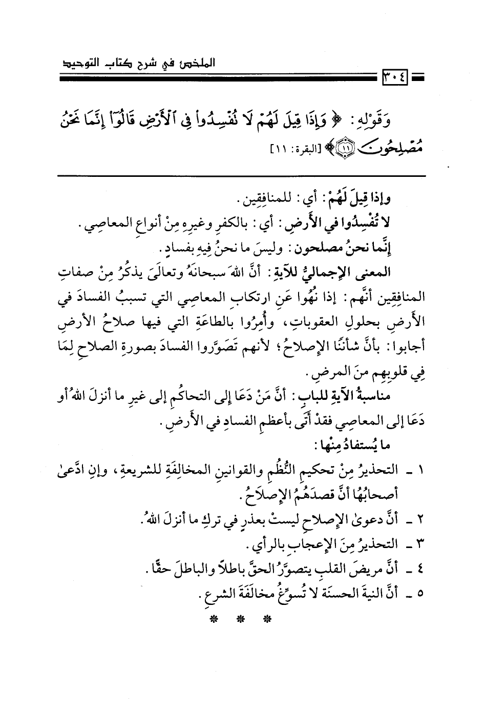 مناسبة الآية للباب: أن من دعا إلى التحاكم إلى ما أنزل الله أو دعا إلى المعاصي فقد أتى بأعظم الفساد في الأرض.