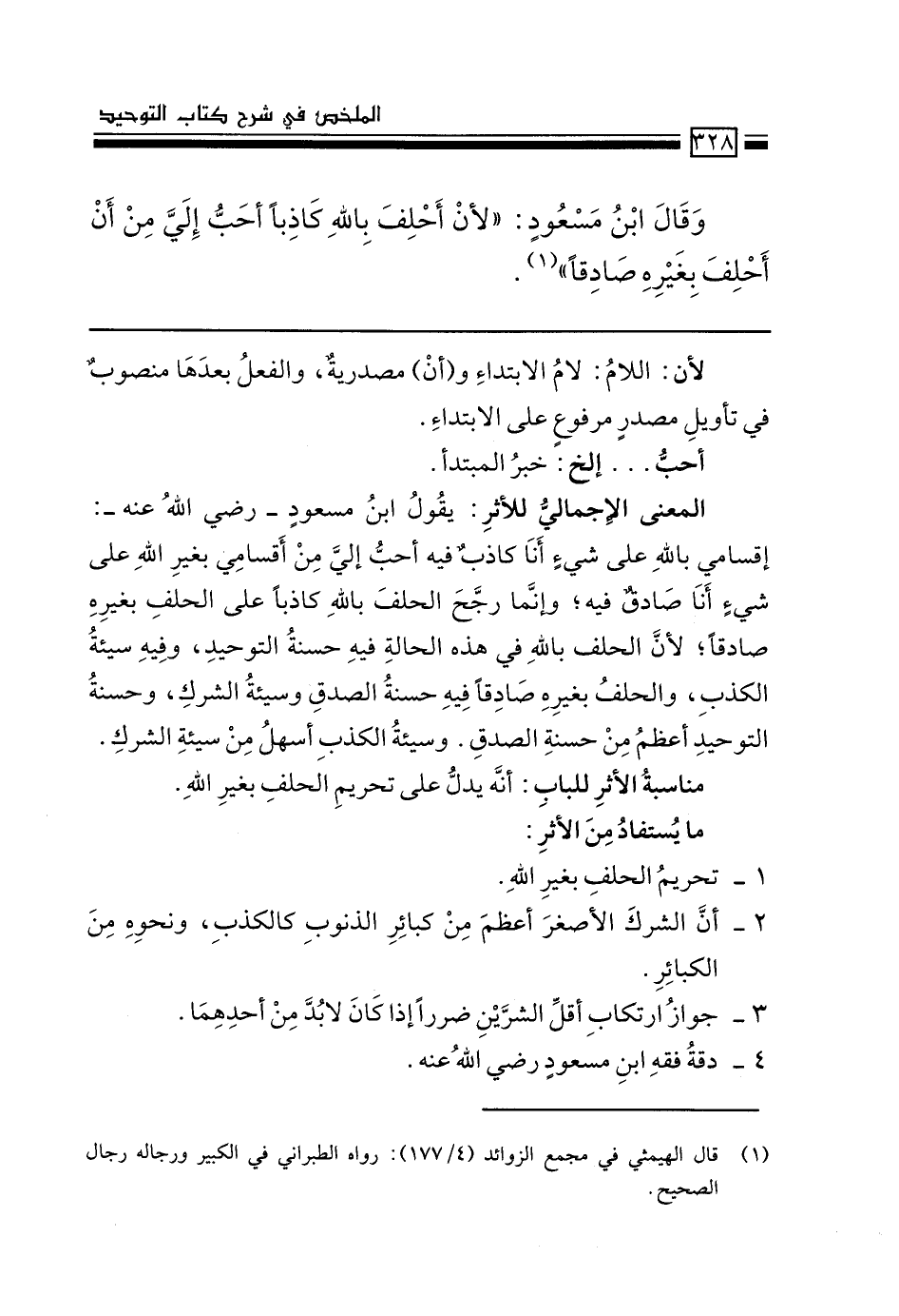 المعنى الإجمالي للأثر: يقول ابن مسعود –رضي الله عنه-: إقسامي بالله على شيء أنا كاذبٌ فيه أحب إلي من إقسامي بغير الله على شيءٌ أنا صادقٌ فيه؛ وإنما رجح الحلف بالله كاذباً على الحلف بغيره صادقاً؛ لأن الحلف بالله فيه هذه الحالة في حسنة التوحيد، وفيه سيئة التوحيد أعظم من حسنة الصدق. وسيئة الكذب أسهل من سيئة الشرك.