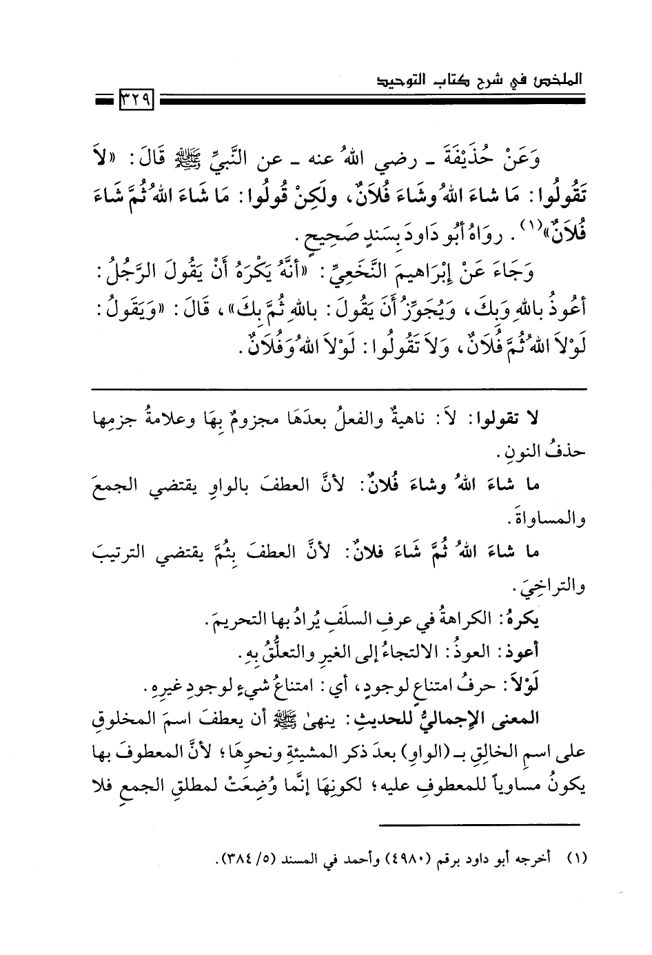 وعن حذيفة -رضي الله عنه- عن النبي - صَلَّى اللَّهُ عَلَيْهِ وَسَلَّمَ- قال: "لا تقولوا: ما شاء الله وشاء فلان، ولكن قولوا: ما شاء الله ثم شاء فلان" (1) رواه أبو داود بسند صحيح.