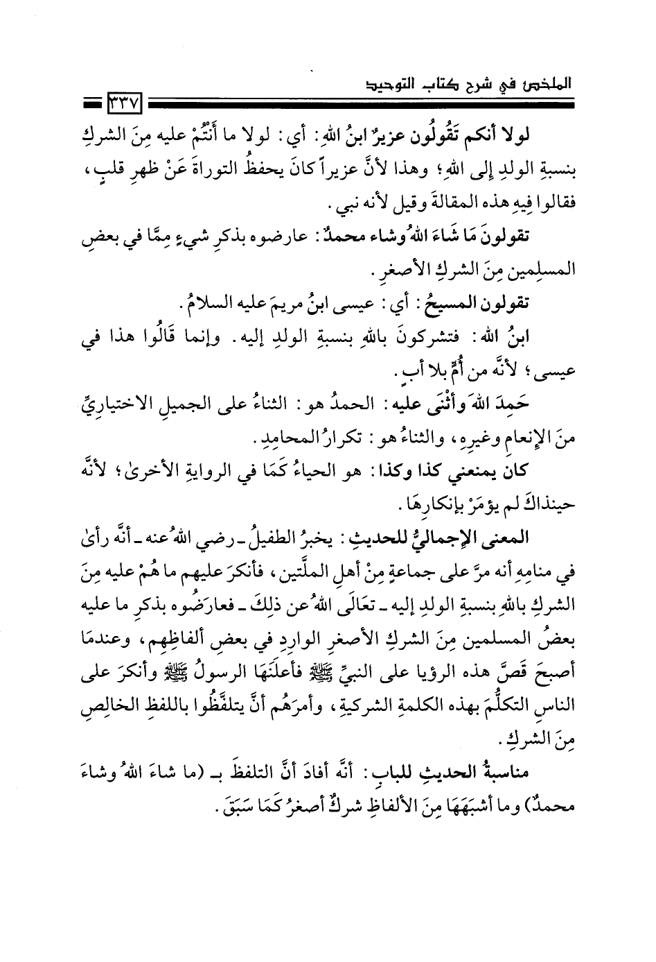 المعنى الإجمالي للحديث: يخبر الطفيل –رضي الله عنه- أنه رأى في منامه أنه مرّ على جماعة من أهل الملّتين، فأنكر عليهم ما هم عليه من الشرك بالله بنسبة الولد إليه –تعالى الله عن ذلك- فعارضوه بذكر ما عليه بعض المسلمين من الشرك الأصغر الوارد في بعض ألفاظهم، وعندما أصبح قصَّ هذه الرؤيا على النبي –صَلَّى اللَّهُ عَلَيْهِ وَسَلَّمَ- فأعلنها الرسول –صَلَّى اللَّهُ عَلَيْهِ وَسَلَّمَ- وأنكر على الناس التكلم بهذه الكلمة الشركية، وأمرهم أن يتلفّظوا باللفظ الخالص من الشرك.