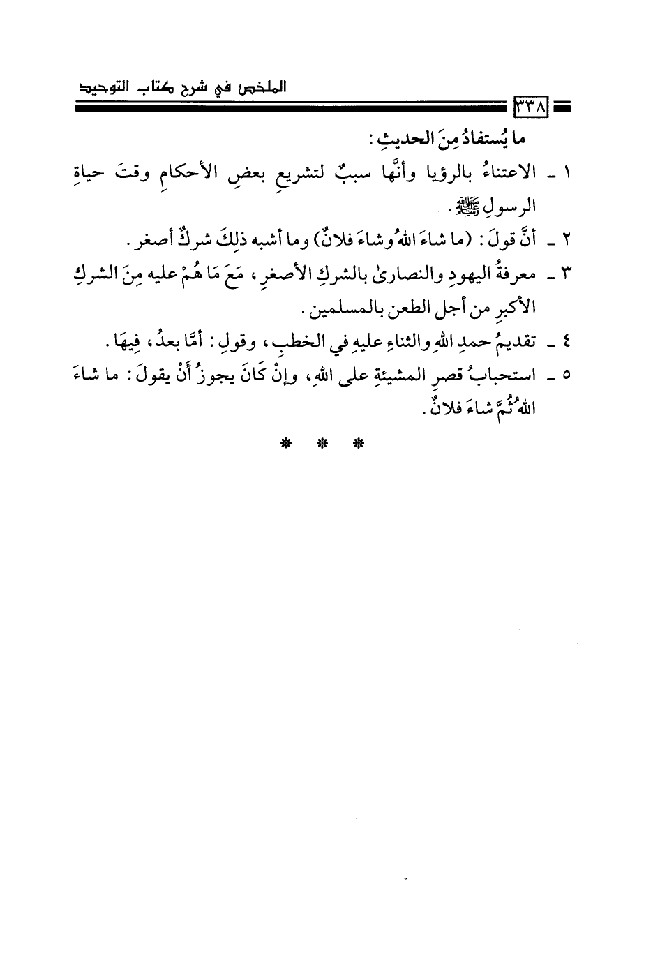 5- استحباب قصر المشيئة على الله، وإن كان يجوز أن يقول: ما شاء الله ثم شاء فلان.