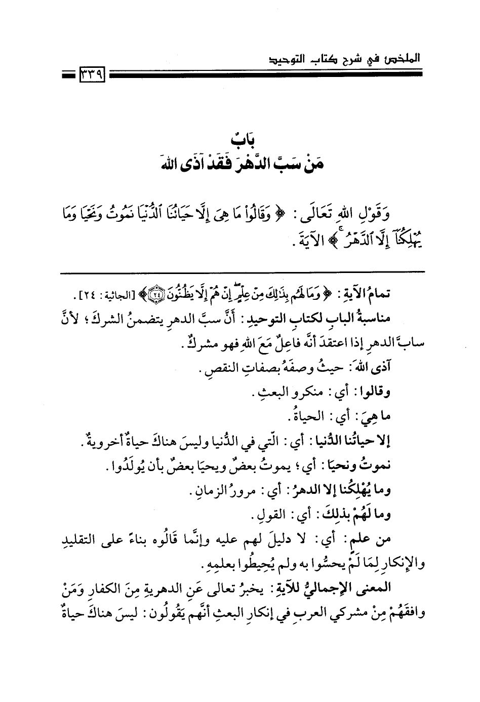 مناسبة الباب لكتاب التوحيد: أن سبّ الدهر يتضمن الشرك؛ لأن سابّ الدهر إذا اعتقد أنه فاعلٌ مع الله فهو مشرك.