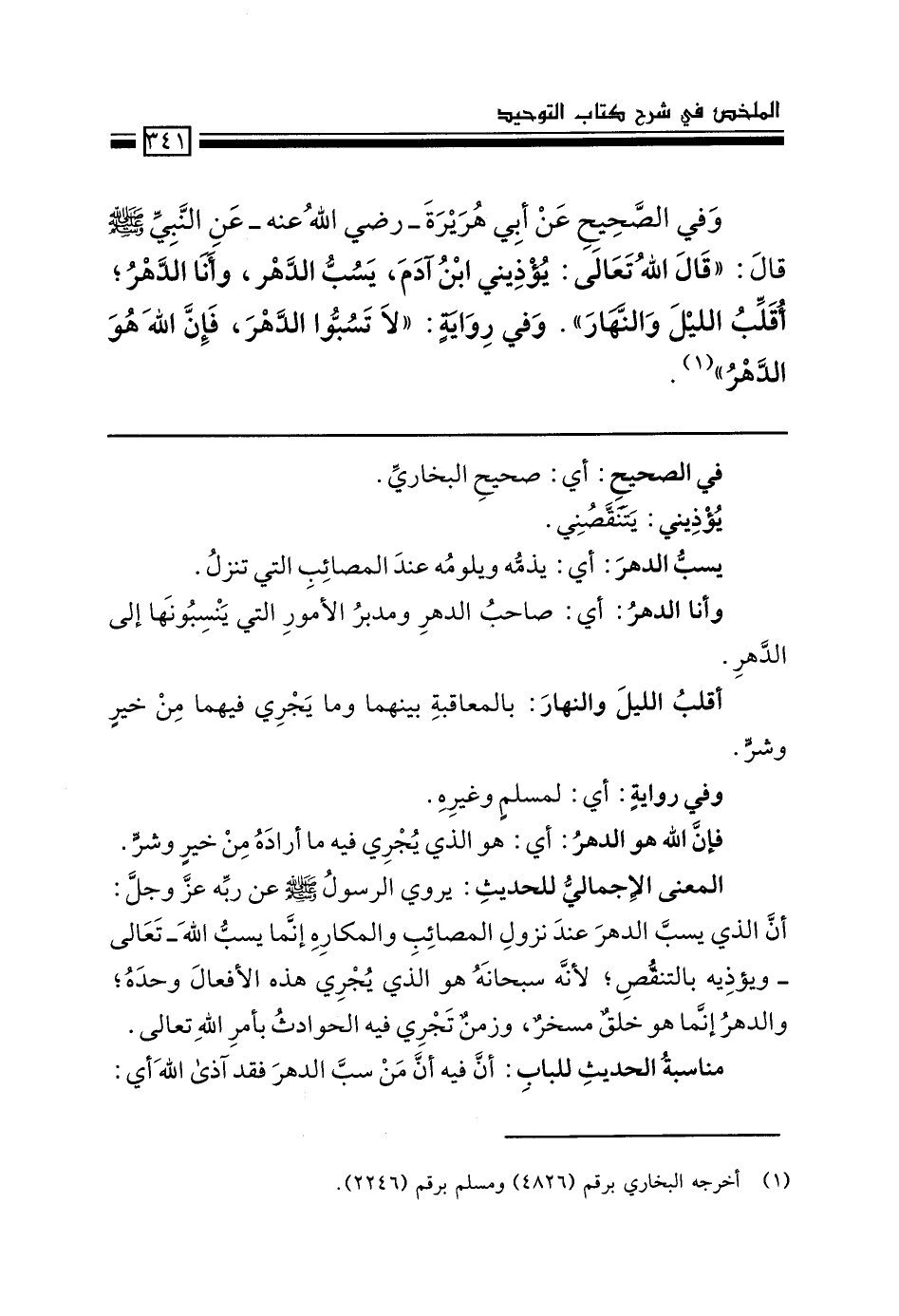 وفي الصحيح عن أبي هريرة –رضي الله عنه- عن النبي - صَلَّى اللَّهُ عَلَيْهِ وَسَلَّمَ- قال: "قال الله تعالى: يؤذيني ابن آدم، يسب الدهر، وأنا الدهر، أُقَلِّب الليل والنهار" وفي رواية: "لا تسبوا الدهر، فإن الله هو الدهر" (1) .