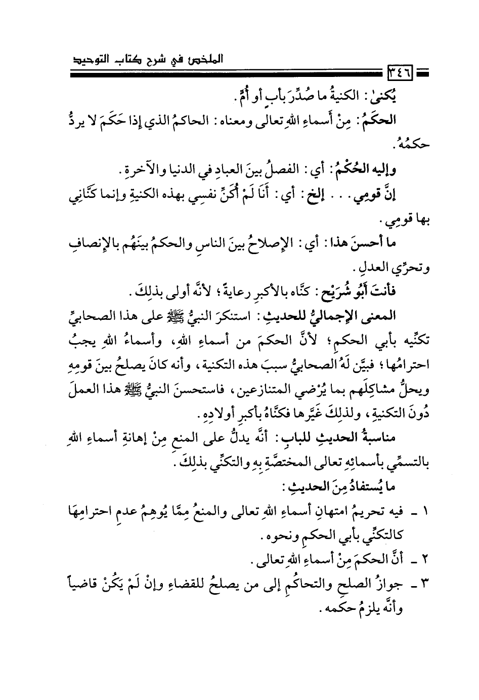 المعنى الإجمالي للحديث: استنكر النبي -صَلَّى اللَّهُ عَلَيْهِ وَسَلَّمَ- على هذا الصحابي تكنِّيه بأبي الحكم؛ لأن الحكم من أسماء الله، وأسماء الله يجب احترامها؛ فبين له الصحابي سبب هذه التكنية، وأنه كان يصلح بين قومه ويحل مشاكلهم بما يُرضي المتنازعين، فاستحسن النبي -صَلَّى اللَّهُ عَلَيْهِ وَسَلَّمَ- هذا العمل دون التكنية، ولذلك غيَّرها فكنَّاه بأكبر أولاده.