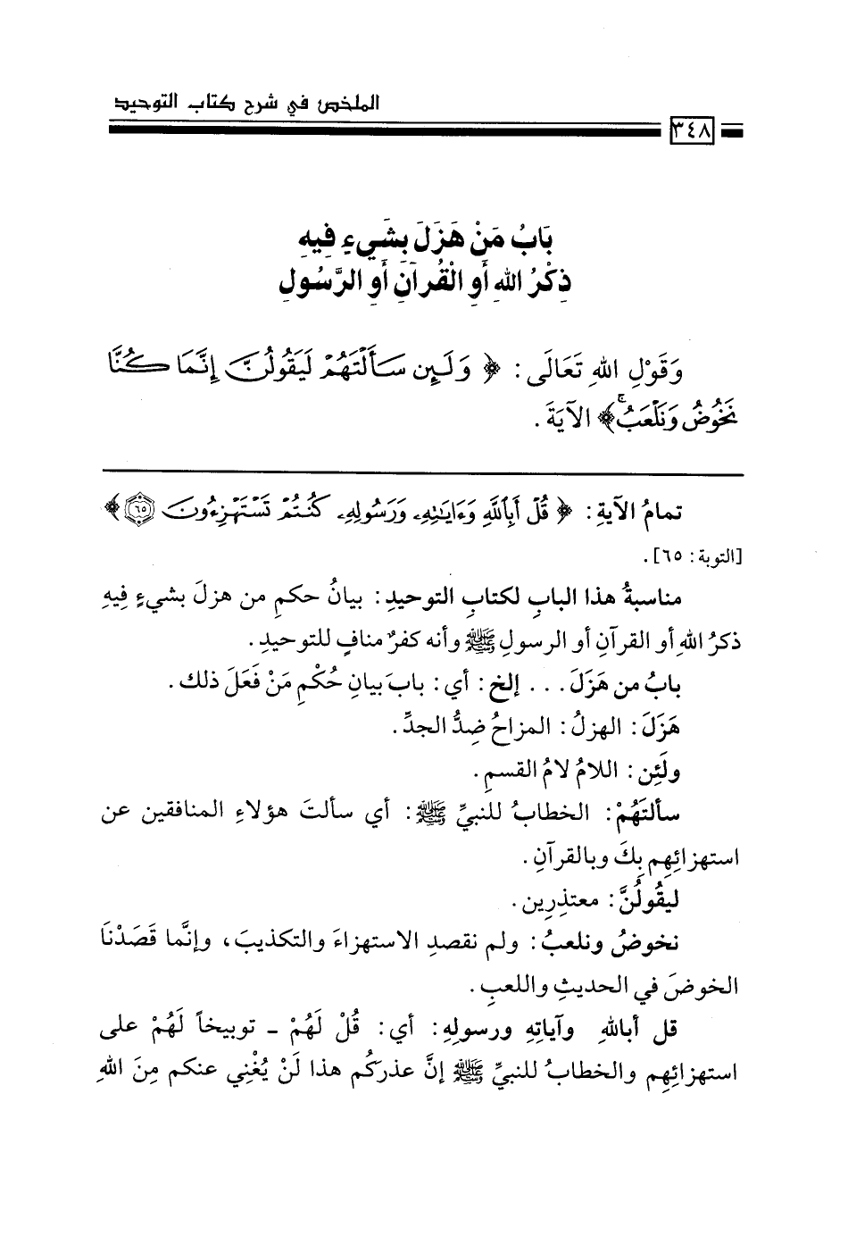مناسبة هذا الباب لكتاب التوحيد: بيان حكم من هزل بشيء فيه ذكر الله أو القرآن أو الرسول -صَلَّى اللَّهُ عَلَيْهِ وَسَلَّمَ- وأنه كفرٌ منافٍ للتوحيد.