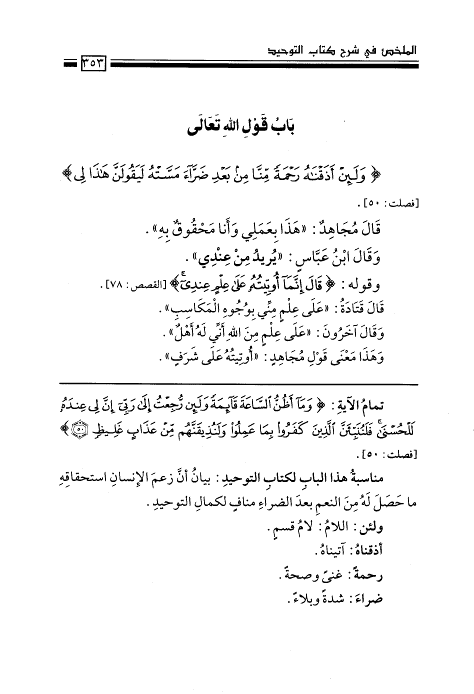 مناسبة هذا الباب لكتاب التوحيد: بيان أن زعْم الإنسان استحقاقَه ما حصل له من النعم بعد الضراء منافٍ لكمال التوحيد.