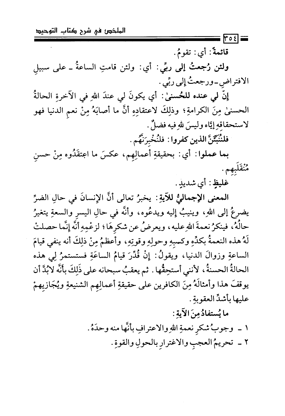 المعنى الإجمالي للآية: يخبر تعالى أن الإنسان في حال الضُّر يضر إلى الله، وينيب إليه ويدعوه، وأنه في حال اليسر والسعة يتغير حالُه، فينكر نعمة الله عليه، ويُعرض عن شكرها؛ لزعمه أنه إنما حصلت له هذه النعمة بكدّه وكسبه وحوله وقوته، وأعظم من ذلك أنه ينفي قيام الساعة وزوال الدنيا، ويقول: إن قدِّر قيام الساعة فستستمر لي هذه الحالة الحسنة، لأنني أستحقها. ثم يعقب سبحانه على ذلك بأنه لا بد أن يوقَف هذا وأمثاله من الكافرين على حقيقة أعمالهم الشنيعة ويجازيهم عليها بأشد العقوبة.