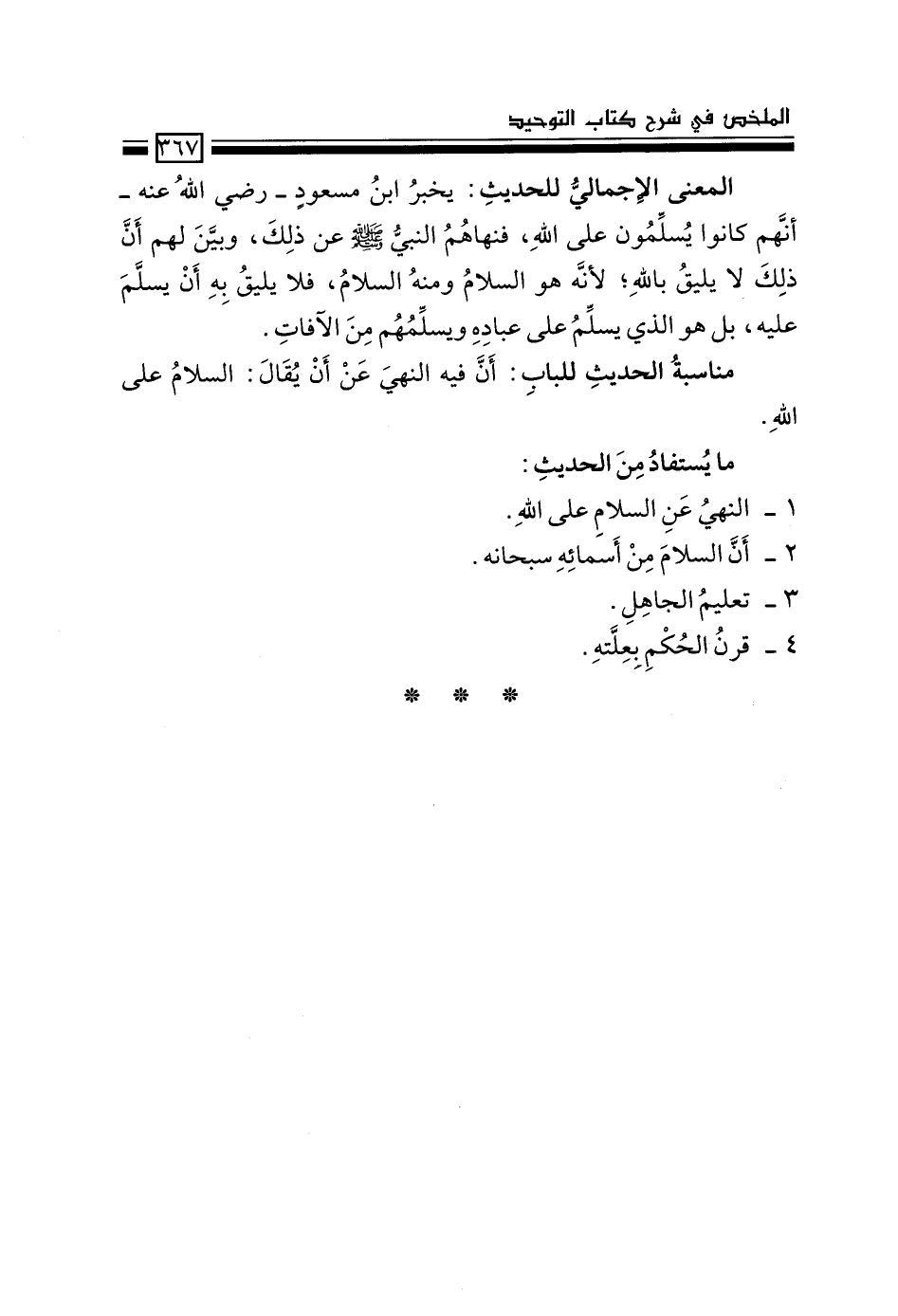 المعنى الإجمالي للحديث: يخبر ابن مسعود -رضي الله عنه- أنهم كانوا يسلِّمون على الله، فنهاهم النبي -صَلَّى اللَّهُ عَلَيْهِ وَسَلَّمَ- عن ذلك، وبيَّن لهم أن ذلك لا يليق بالله؛ لأنه هو السلام ومنه السلام، فلا يليق به أن يسلَّم عليه، بل هو الذي يسلِّم على عباده ويسلِّمهم من الآفات.