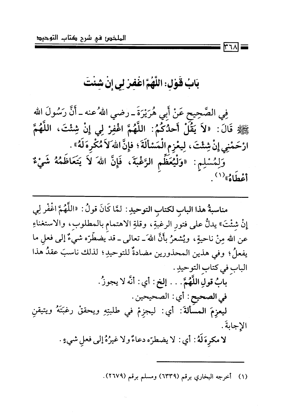 مناسبة هذا الباب لكتاب التوحيد: لمَّا كان قول: "اللهم اغفر لي إن شئت" يدل على فتور الرغبة، وقلة الاهتمام بالمطلوب، والاستغناء عن الله من ناحية، ويُشعر بأن الله -تعالى- قد يضطرّه شيءٌ إلى فعل ما يفعل؛ وفي هذين المحذورين مضادةٌ للتوحيد؛ لذلك ناسب عقدُ هذا الباب في كتاب التوحيد.