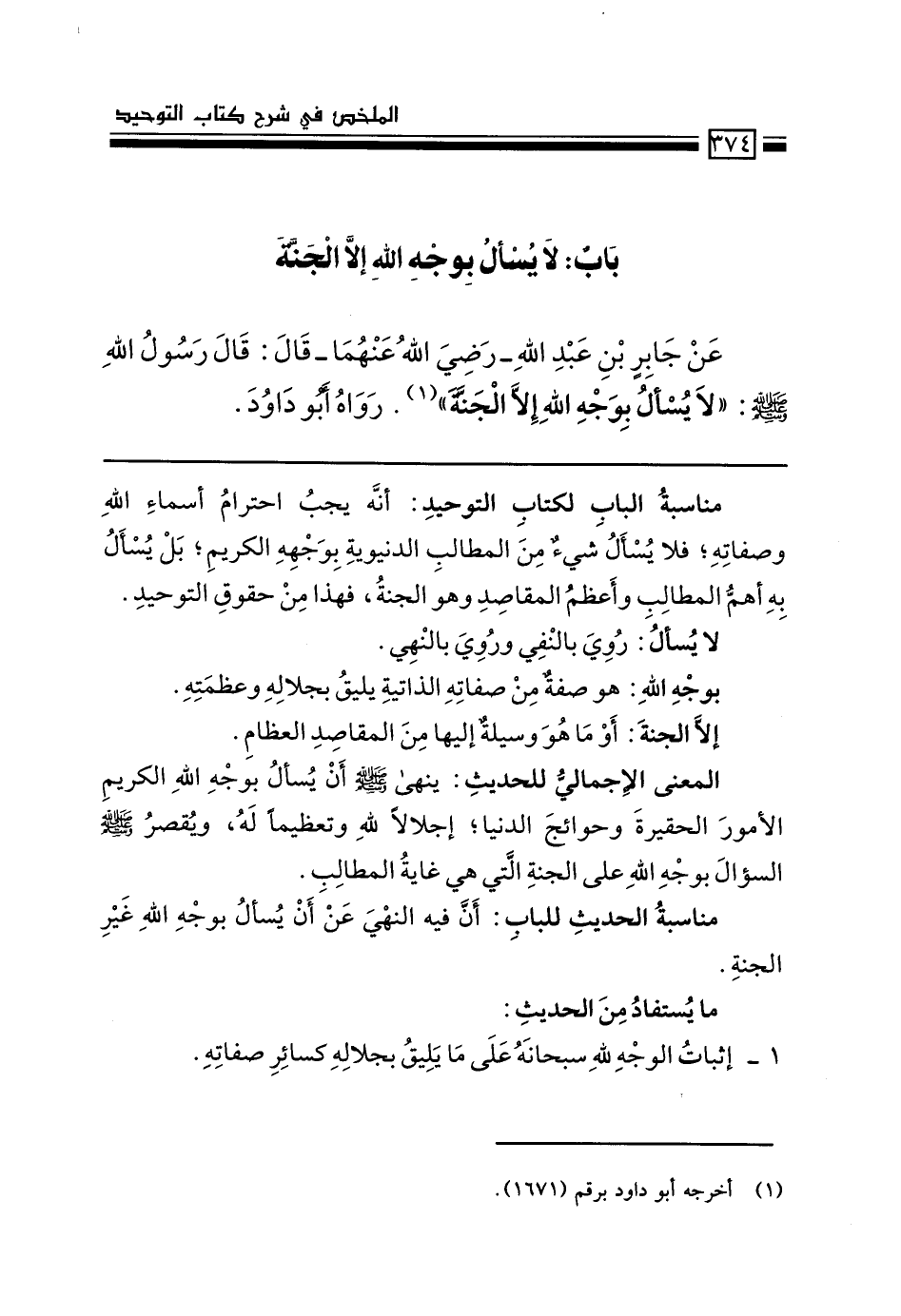 عن جابر بن عبد الله -رضي الله عنهما- قال: قال رسول الله - صَلَّى اللَّهُ عَلَيْهِ وَسَلَّمَ-: "لا يُسأل بوجه الله إلا الجنة" (1) . رواه أبو داود.