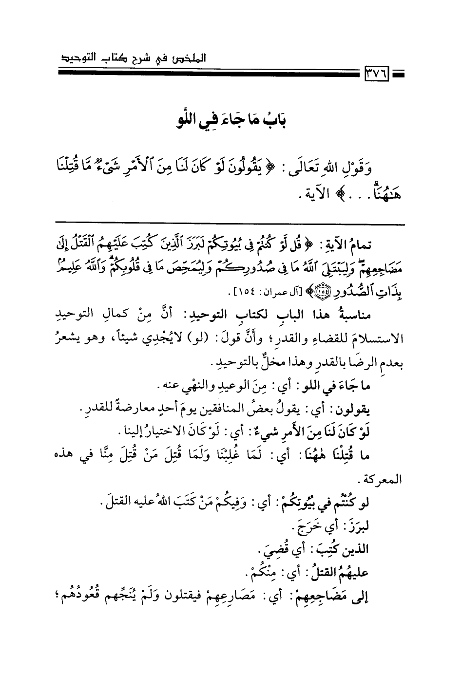 مناسبة هذا الباب لكتاب التوحيد: أن من كمال التوحيد الاستسلام للقضاء والقدر؛ وأن قول "لو" لا يُجدي شيئاً، وهو يشعر بعدم الرضا بالقدر وهذا مخلٌّ بالتوحيد.