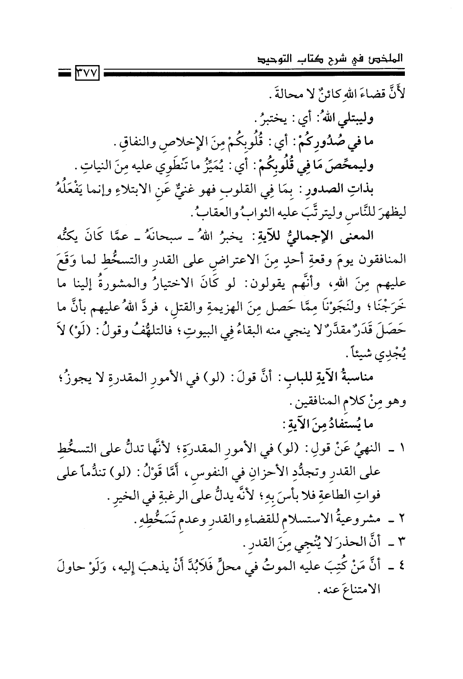 المعنى الإجمالي للآية: يخبر الله –سبحانه- عما كان يكنه المنافقون يوم وقعة أحد من الاعتراض على القدر والتسخط لما وقع عليهم من الله، وأنهم يقولون: لو كان الاختيار والمشورة إلينا ما خرجنا؛ ولنجونا مما حصل من الهزيمة والقتل، فرد الله عليهم بأن ما حصل قدرٌ مقدَّر لا ينجي منه البقاء في البيوت؛ فالتلهّف وقول: "لو" لا يجدي شيئاً.