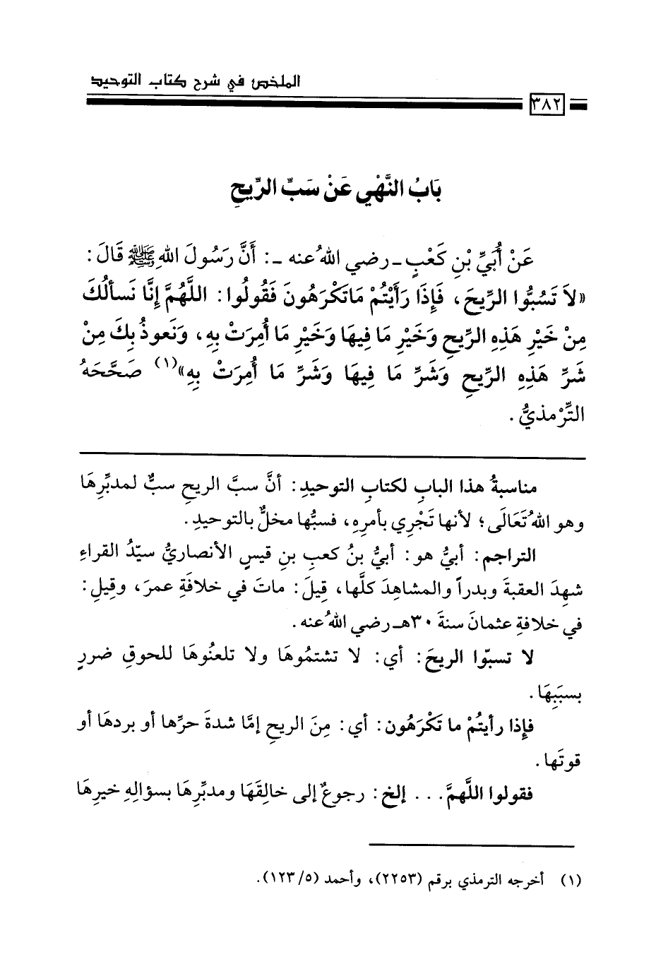 مناسبة هذا الباب لكتاب التوحيد: أن سبّ الريح سبٌّ لمدبّرها وهو الله تعالى؛ لأنها تجري بأمره، فسبُّها مخلٌّ بالتوحيد.