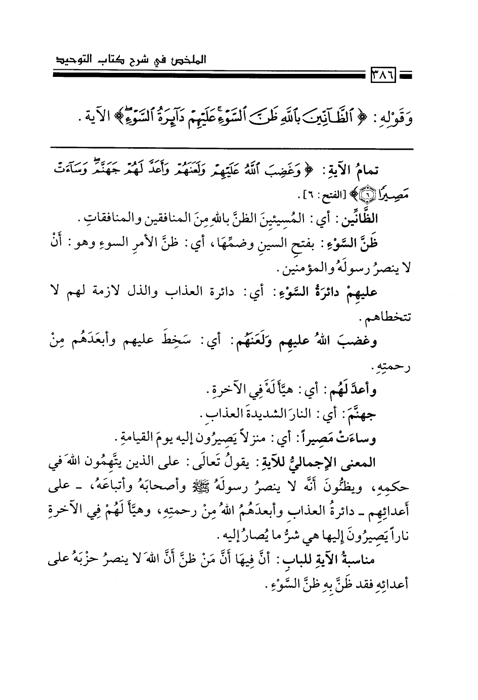 تمام الآية: {وَغَضِبَ اللهُ عَلَيْهِمْ وَلَعَنَهُمْ وَأَعَدَّ لَهُمْ جَهَنَّمَ وَسَاءتْ مَصِيرًا} [الفتح: 6] .