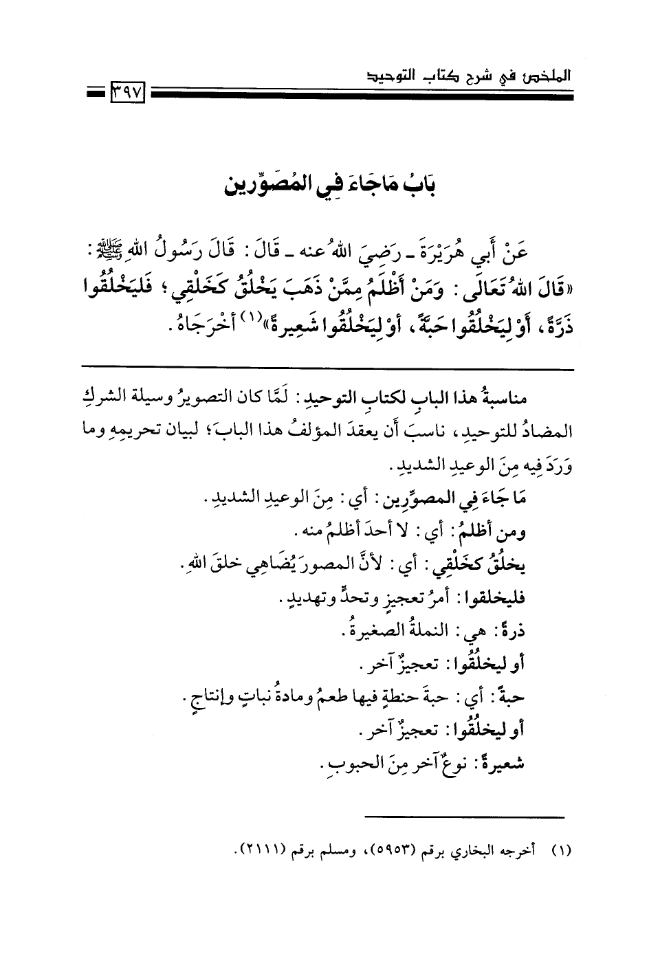 عن أبي هريرة -رضي الله عنه- قال: قال رسول الله - صَلَّى اللَّهُ عَلَيْهِ وَسَلَّمَ-: "قال الله تعالى: ومن أظلم ممن ذهب يخلق كخلقي؛ فليخلقوا ذرة، أو ليخلقوا حبة، أو ليخلقوا شعيرة" (1) أخرجاه.