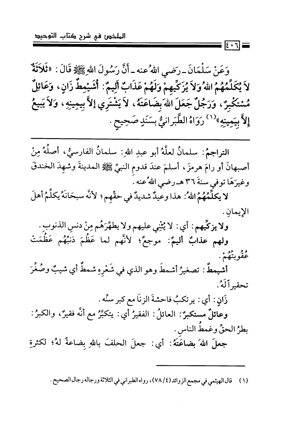 وعن سلمان -رضي الله عنه أن رسول الله –صَلَّى اللَّهُ عَلَيْهِ وَسَلَّمَ- قال: "ثلاثة لا يكلمهم الله ولا يزكيهم ولهم عذاب أليم: أُشَيْمِط زانٍ، وعائل مستكبِر، ورجل جعل اللهَ بضاعتَه، لا يشتري إلا بيمينه، ولا يبيع إلا بيمينه" (1) رواه الطبراني بسند صحيح.