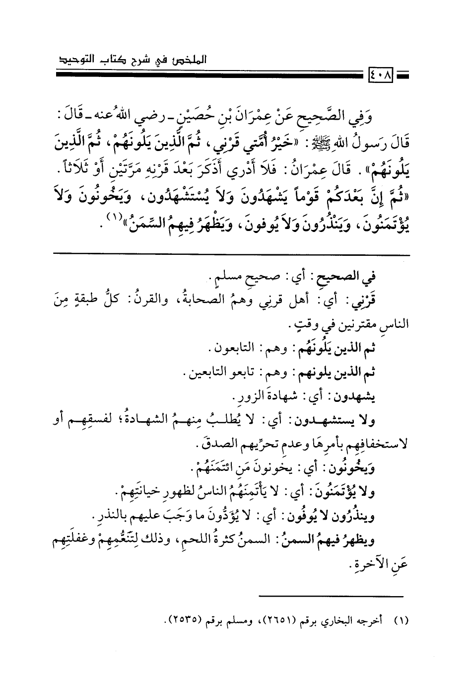 وفي الصحيح عن عمران بن حصين -رضي الله عنه- قال: قال رسول الله - صَلَّى اللَّهُ عَلَيْهِ وَسَلَّمَ-: "خير أمتي قرني، ثم الذين يلونهم ثم الذين يلونهم". قال عمران: فلا أدري أذكر بعد قرنِه مرتين أو ثلاثاً. "ثم إن بعدكم قوماً يشهدون ولا يستشهدون، ويخونون ولا يؤتمنون، وينذرون ولا يوفون، ويظهر فيهم السمن" (1) .