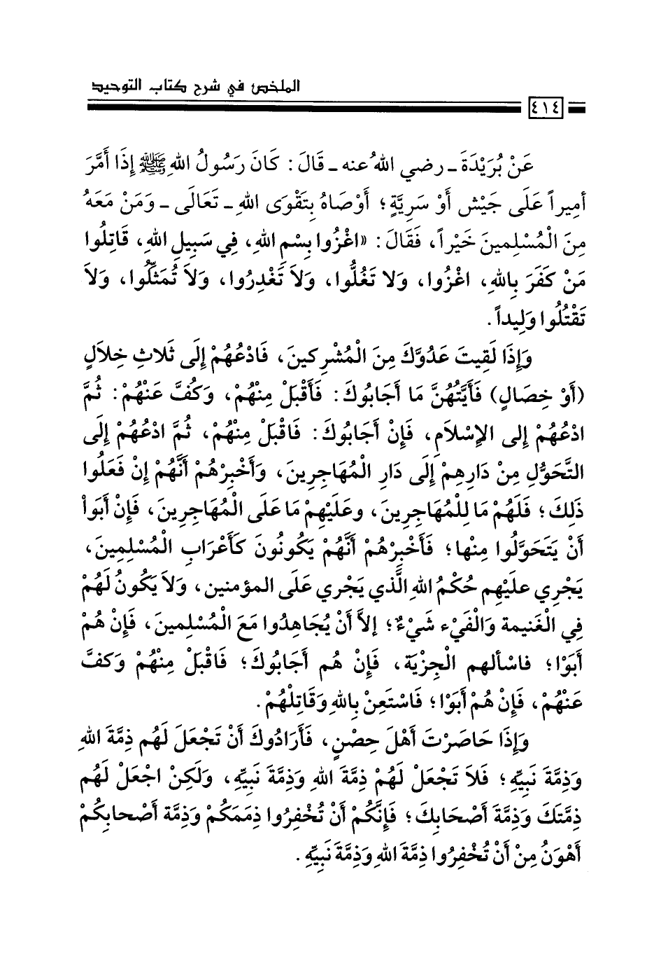 وإذا لقِيت عدوك من المشركين، فادعهم إلى ثلاث خلال "أو خصال" فأيَّتُهُنَّ ما أجابوك: فاقبل منهم وكُفَّ عنهم: ثم ادعُهم إلى الإسلام، فإن أجابوك فاقبل منهم، ثم ادعهم إلى التحول من دارهم إلى دار المهاجرين، وأخبِرهم أنهم إن فعلوا ذلك؛ فلهم ما للمهاجرين، وعليهم ما على المهاجرين، فإن أبوا أن يتحولوا منها؛ فأخبرهم أنهم يكونون كأعراب المسلمين، يجري عليهم حكم الله الذي يجري على المؤمنين، ولا يكون لهم في الغنيمة والفيء شيءٌ، إلا أن يجاهدوا مع المسلمين، فإن هم أبوا؛ فاسألهم الجزية، فإن هم أجابوك؛ فاقبل منهم وكف عنهم، فإن هم أبوا؛ فاستعن بالله وقاتلهم.