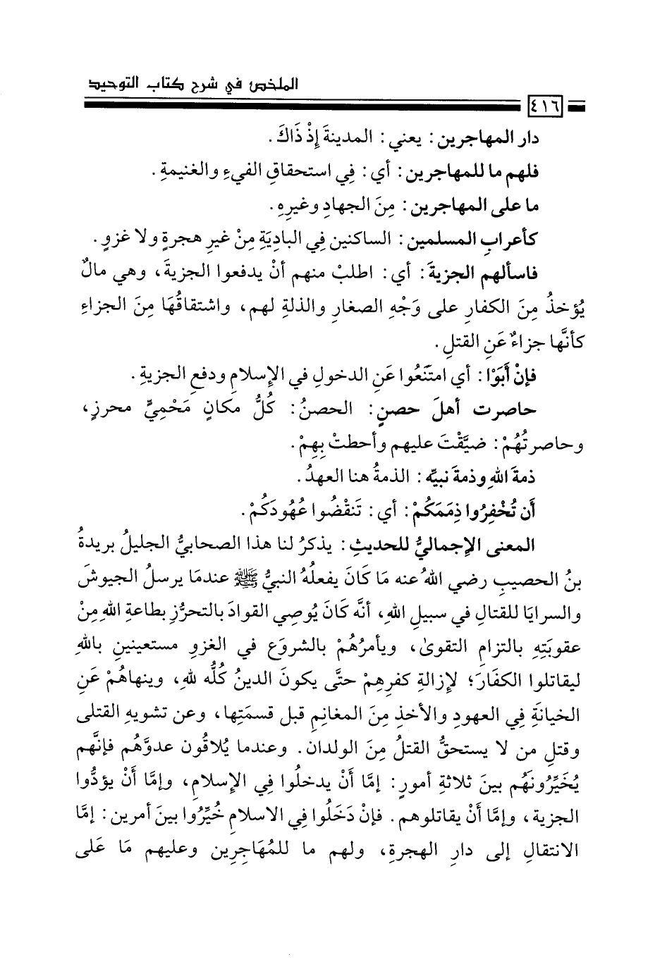 المعنى الإجمالي للحديث: يذكر لنا هذا الصحابي الجليل بريدة بن الحصيب رضي الله عنه ما كان يفعله النبي –صَلَّى اللَّهُ عَلَيْهِ وَسَلَّمَ- عندما يرسل الجيوش والسرايا للقتال في سبيل الله، أنه كان يوصي القواد بالتحرز بطاعة الله من عقوبته بالتزام التقوى، ويأمرهم بالشروع في الغزو مستعينين بالله ليقاتلوا الكفار؛ لإزالة كفرهم حتى يكون الدين كله لله، وينهاهم عن الخيانة في العهود والأخذ من المغانم قبل قسمتها، وعن تشويه القتلى وقتل من لا يستحق القتل من الولدان. وعندما يلاقون عدوهم فإنهم يخيِّرونهم بين ثلاثة أمور: إما أن يدخلوا في الإسلام، وإما أن يؤدوا الجزية، وإما أن يقاتلوهم. فإن دخلوا في الإٍسلام خُيروا بين أمرين: إما الانتقال إلى دار الهجرة، ولهم ما للمهاجرين وعليهم ما على