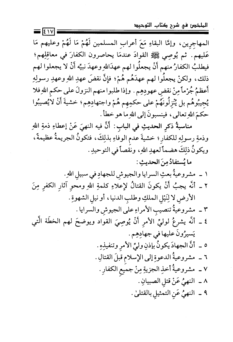 المهاجرين، وإما البقاء مع أعراب المسلمين لهم ما لهم وعليهم ما عليهم. ثم يوصي –صَلَّى اللَّهُ عَلَيْهِ وَسَلَّمَ- القواد عندما يحاصرون الكفّار في معاقِلهم؛ فيطلب الكفّار منهم أن يجعلوا لهم عهد الله وعهد نبيه أن لا يجعلوا لهم ذلك، ولكن يجعلوا لهم عهدهم هم؛ فإنّ نقض عهد الله وعهد رسوله أعظم جُرماً من نقض عهودهم. وإذا طلبوا منهم النزول على حكم الله فلا يجيبوهم بل ينزلونهم على حكمهم هم واجتهادهم؛ خشية أن لا يُصيبوا حكم الله تعالى، فينسبون إلى الله ما هو خطأ.