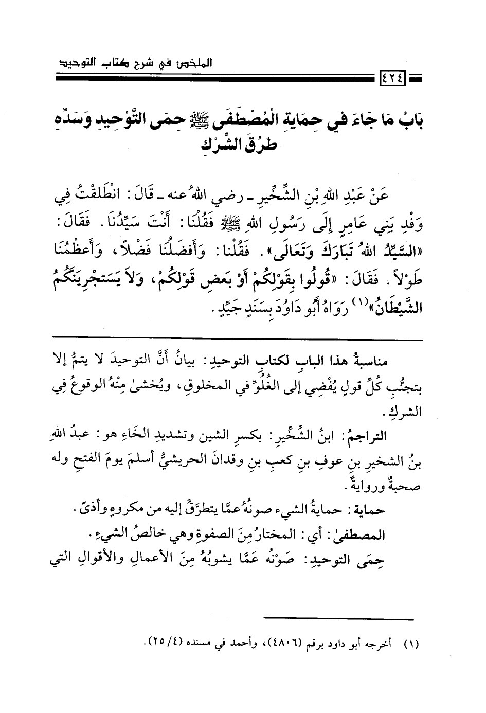 عن عبد الله بن الشِّخِّير -رضي الله عنه- قال: انطلقتُ في وفد بني عامر إلى رسول الله - صَلَّى اللَّهُ عَلَيْهِ وَسَلَّمَ- فقلنا: أنت سيِّدنا. فقال: "السيد الله تبارك وتعالى". فقلنا: وأفضلنا فضلاً، وأعظمنا طولاً. فقال: "قولوا بقولكم، أو بعض قولكم، ولا يستجرينكم الشيطان" (1) رواه أبو داود بسند جيِّد.