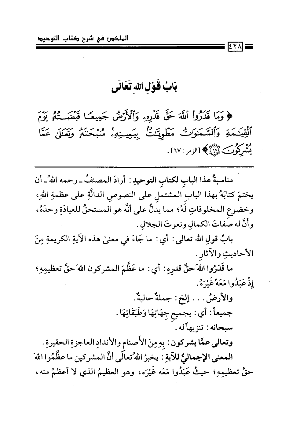 مناسبة هذا الباب لكتاب التوحيد: أراد المصنف -رحمه الله- أن يختم كتابه بهذا الباب المشتمل على النصوص الدالة على عظمة الله، وخضوع المخلوقات له؛ مما يدل على أنه هو المستحق للعبادة وحده، وأن له صفات الكمال ونعوت الجلال.