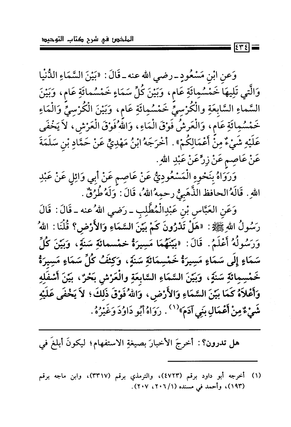 وعن العباس بن عبد المطلب -رضي الله عنه- قال: قال رسول الله - صَلَّى اللَّهُ عَلَيْهِ وَسَلَّمَ-: "هل تدرون كم بين السماء والأرض؟ " قلنا: الله ورسوله أعلم. قال: "بينهما مسيرة خمسمائة سنة، وبين كل سماء إلى سماء مسيرة خمسمائة سنة، وكِثَفُ كل سماء مسيرة خمسمائة سنة، وبين السماء السابعة والعرش بحرٌ، بين أسفله وأعلاه كما بين السماء والأرض، والله فوق ذلك؛ لا يخفى عليه شيء من أعمال بني آدم" (1) . رواه أبو داود وغيره.