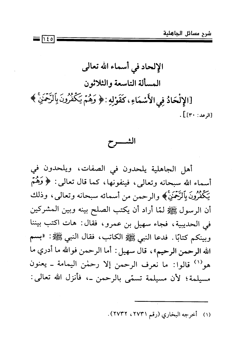 أهل الجاهلية يلحدون في الصفات، ويلحدون في أسماء الله سبحانه وتعالى، فينفونها، كما قال تعالى: {وَهُمْ يَكْفُرُونَ بِالرَّحْمَنِ} والرحمن من أسمائه سبحانه وتعالى، وذلك أن الرسول صلى الله عليه وسلم لمّا أراد أن يكتب الصلح بينه وبين المشركين في الحديبية، فجاء سهيل بن عمرو، فقال: هات اكتب بيننا وبينكم كتاباً. فدعا النبي صلى الله عليه وسلم الكاتب، فقال النبي صلى الله عليه وسلم: "بسم الله الرحمن الرحيم"، قال سهيل: أما الرحمن فوالله ما أدري ما هو 1قالوا: ما نعرف الرحمن إلا رحمن اليمامة –يعنون مسيلمة؛ لأن مسيلمة تسمّى بالرحمن -،فأنزل الله تعالى:
